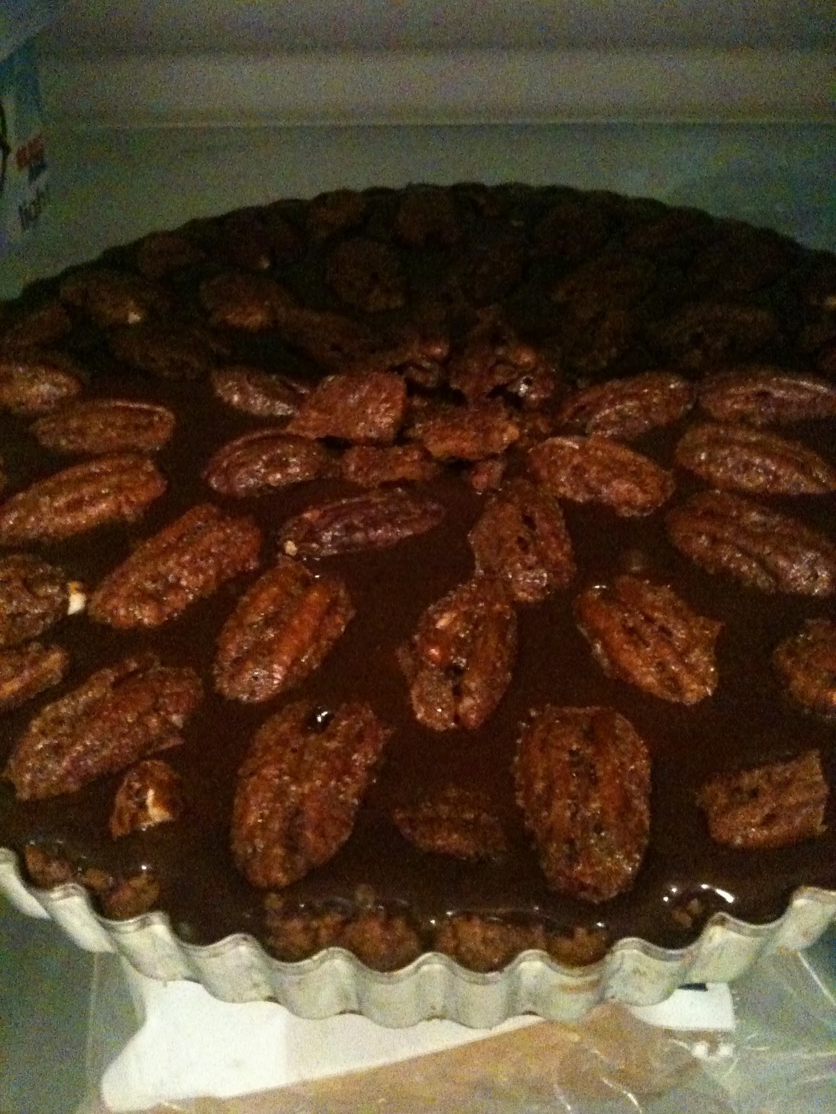 I followed a recipe on epicurious for the filling and pecans, but switched up the crust. Instead of chocolate cookie crumbs I used shortbread (and then less butter than the recipe called for). I could say that there was some strategic planning in this shortbread decision, but the truth was - since I was to busy (lazy) to go out and buy the chocolate cookies I took stock of my cupboards and found some lovely shortbread that someone had given me for a Christmas present and used that instead. Worked a treat!